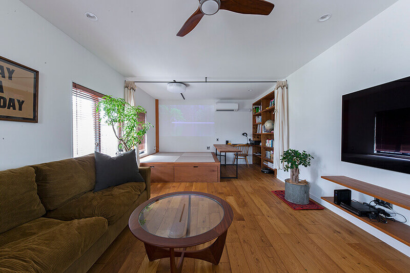 もともと和室があった場所に設置したデスク&本棚を備えたワークスペースと小上がりの畳スペースはカーテンで緩く仕切れるようにし、寮生活中のお子様が帰宅された際に寝泊まりしていただけるようにしています。