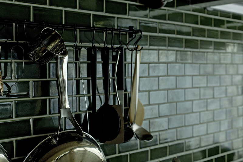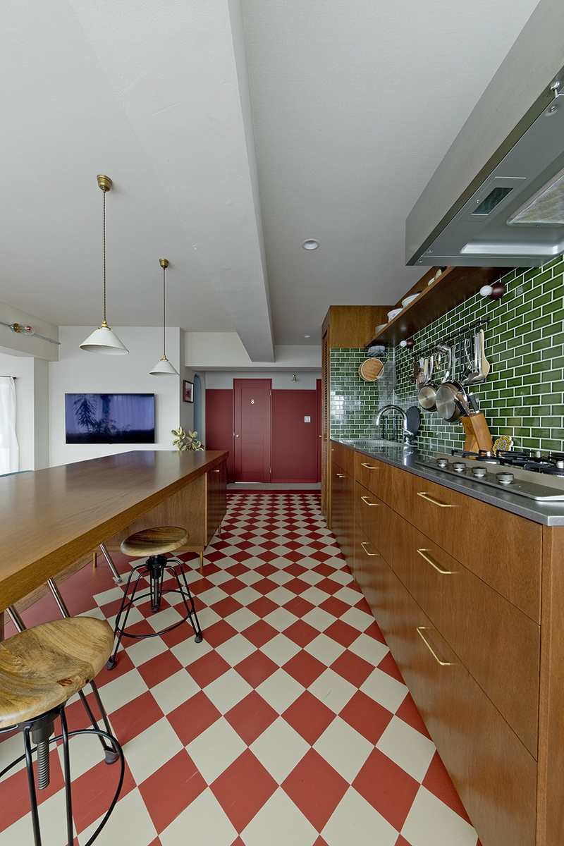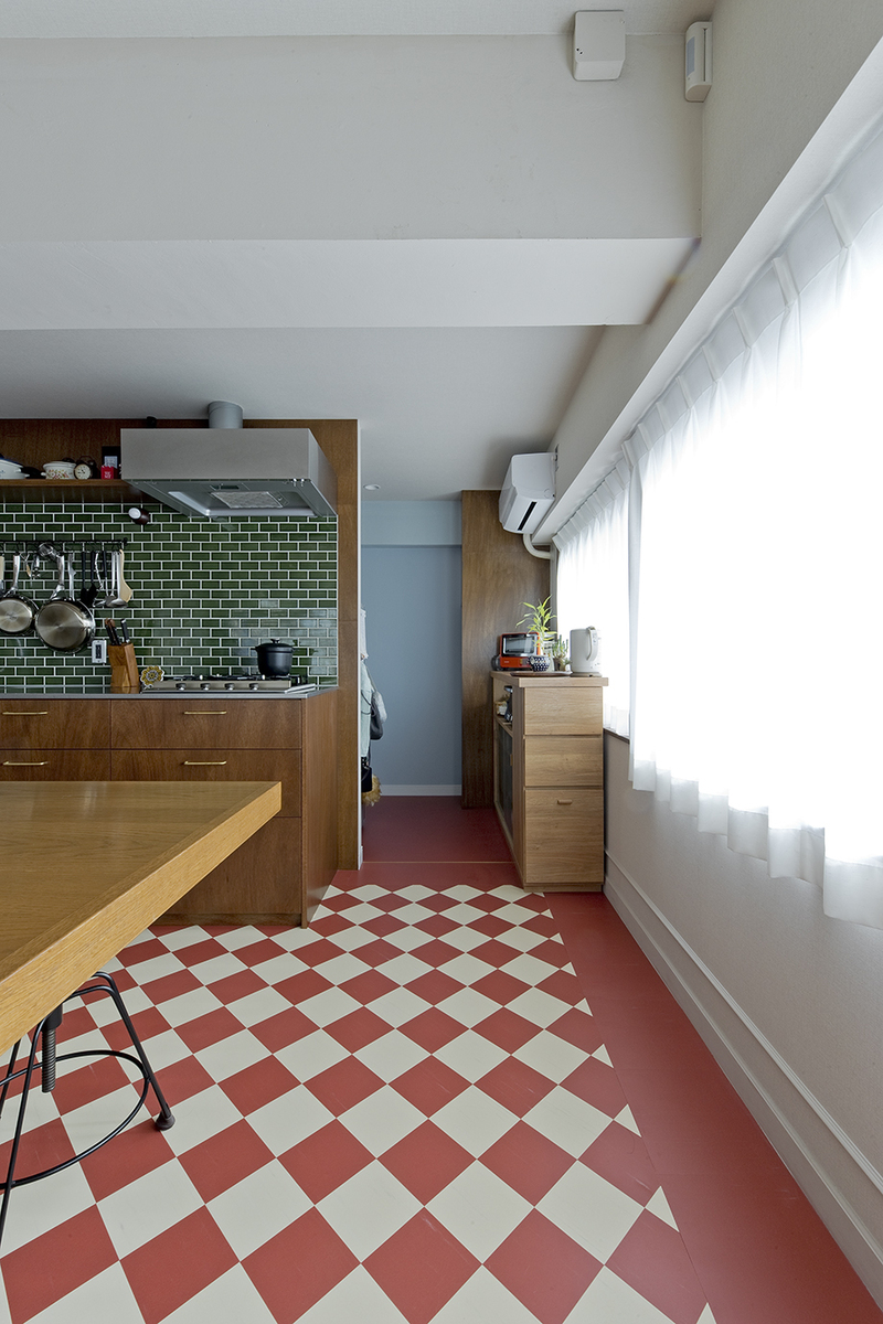 キッチンは、床材のカラーにあわせグリーンタイルをコーディネートし唯一無二のデザインに。