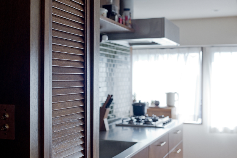 窓に囲まれた間取りの特性を活かし、壁付けとせずキッチン背面に通路を設けることで回遊動線を確保しました。