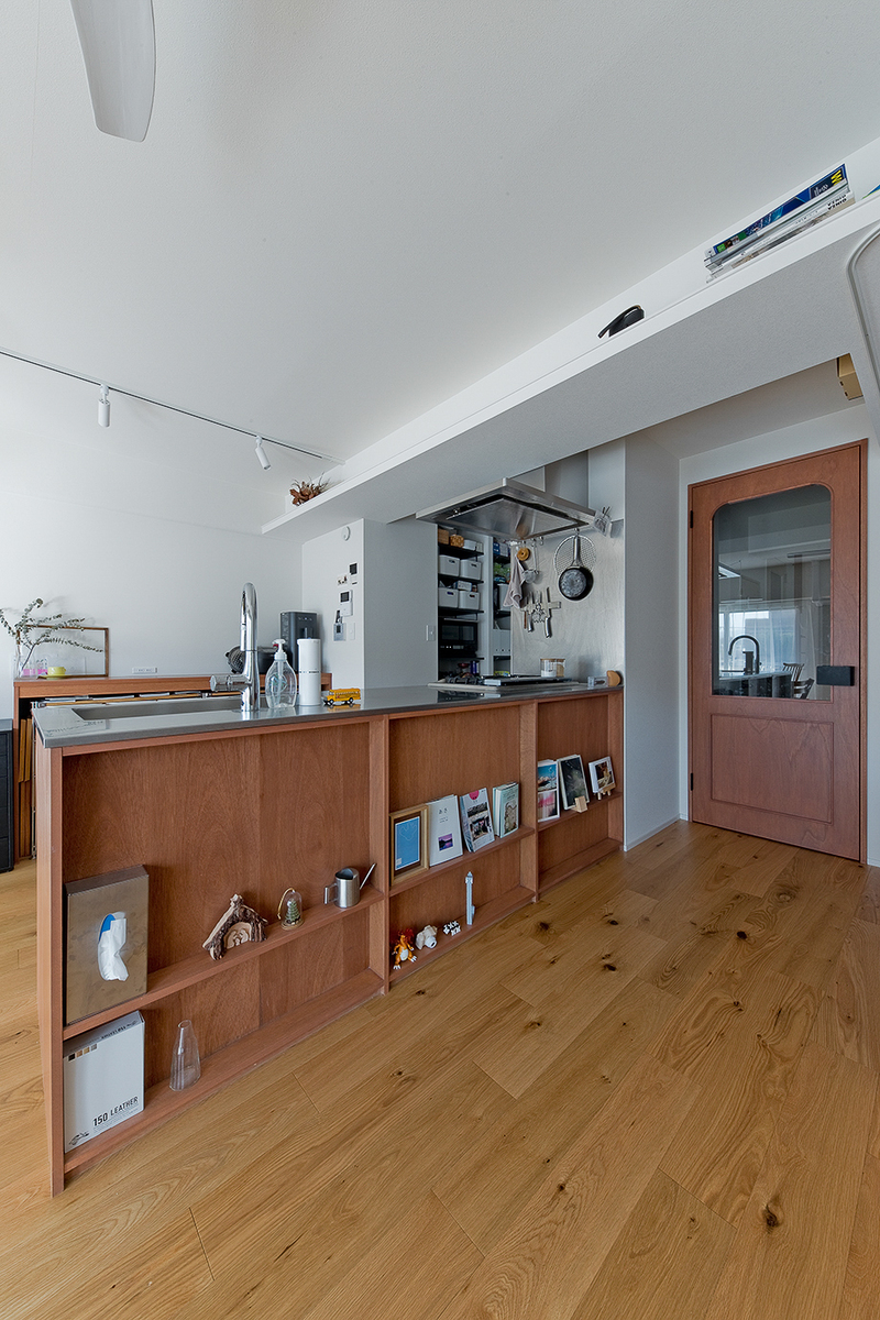 キッチンのカップボードなどの造作家具は、経年変化を味わうことができるように薄めの塗装を施しました。
