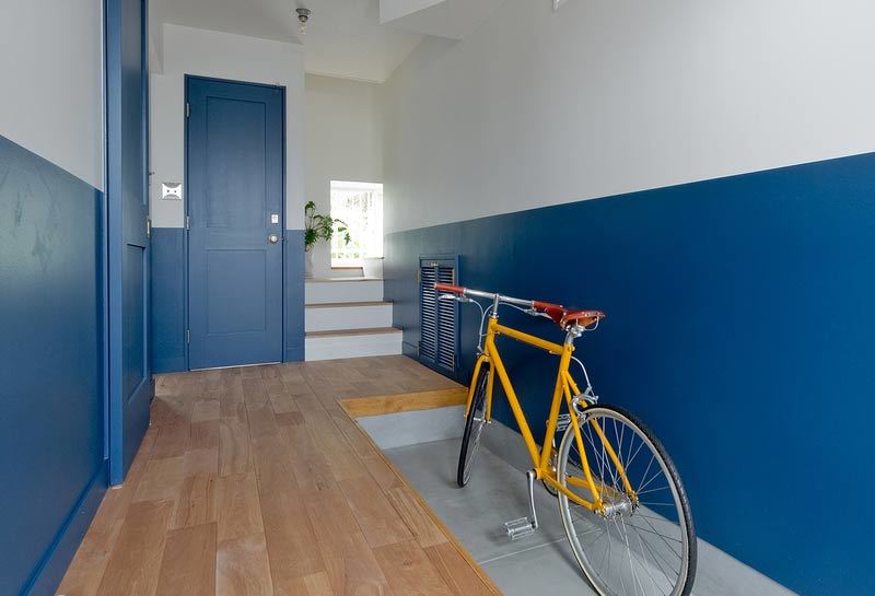 1Fの広い玄関ホールは、壁の腰から下をブルーに塗装し、建具も同じ色で統一してカジュアルに。