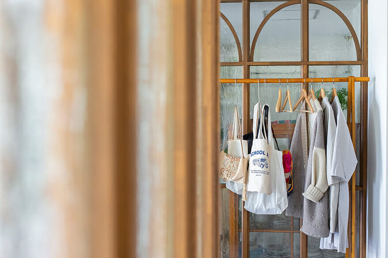 無垢・タイルなどを明るい色味でまとめあげ造作の建具や間仕切りを工夫することで空間全体が緩くつながる華やかな印象に。