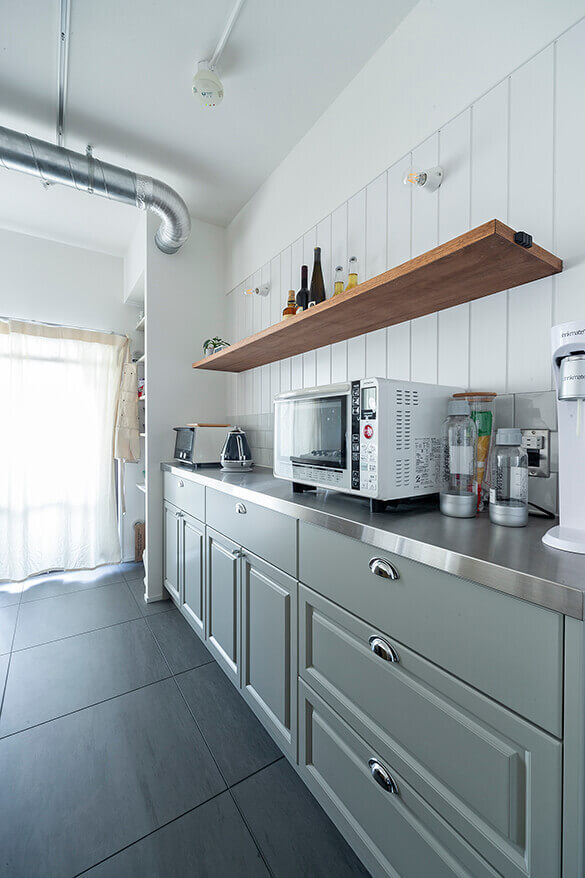 背面の壁は艶のあるグレータイルと塗装の木板をあしらい、