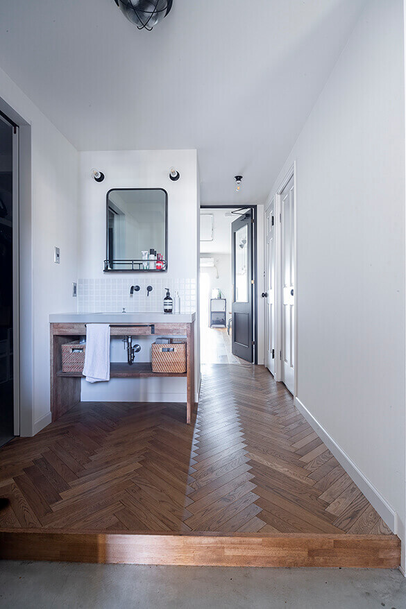を理想とされていたこともあり、広げた玄関ホールには無垢のヘリンボーン床とよく馴染む造作の洗面台を設置。憧れの動線が実現しました。