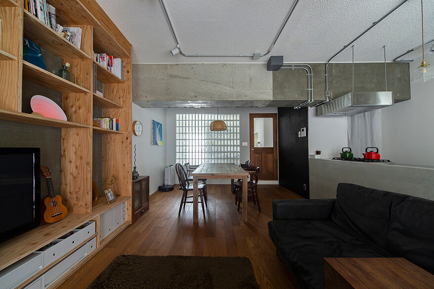 玄関からの光を優しく通すガラスブロックでレトロ感を演出し、遮光に障子を採用することで和のディテールを踏襲。