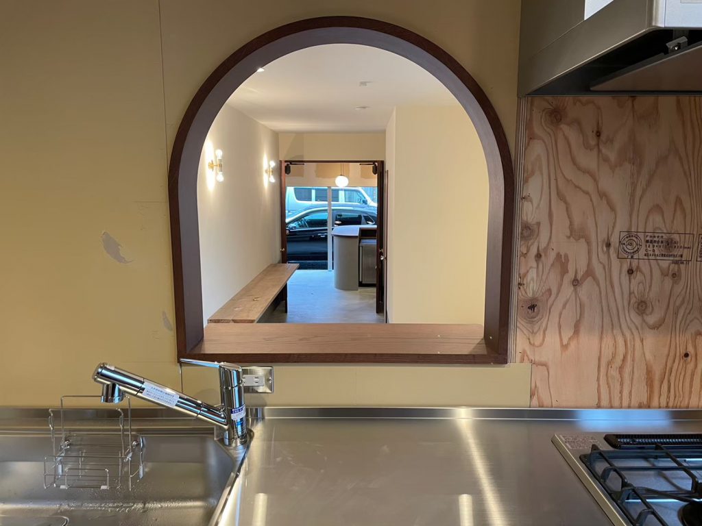モルタルと合板、カウンターがメインとなる店構えにしモルタルでアールを造りました。
