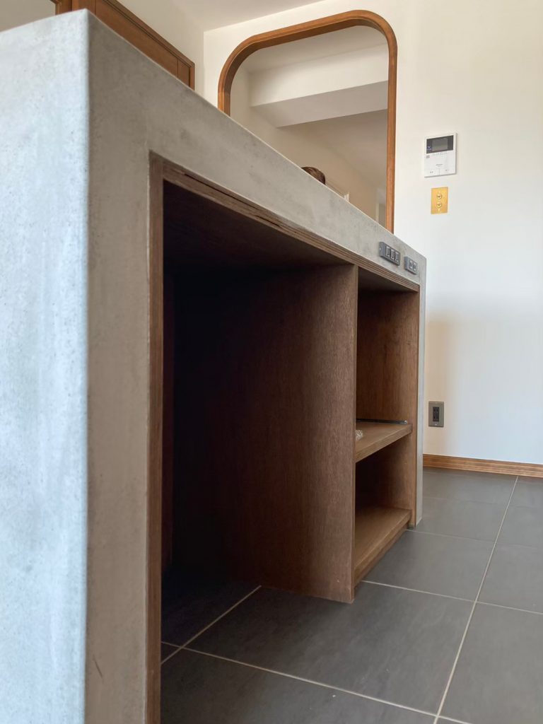 腰壁はコンクリート調でかっこいいながらも木材とのバランスや床以外の色目を淡いものでまとめ、照明や棚受けの金具をゴールドにして