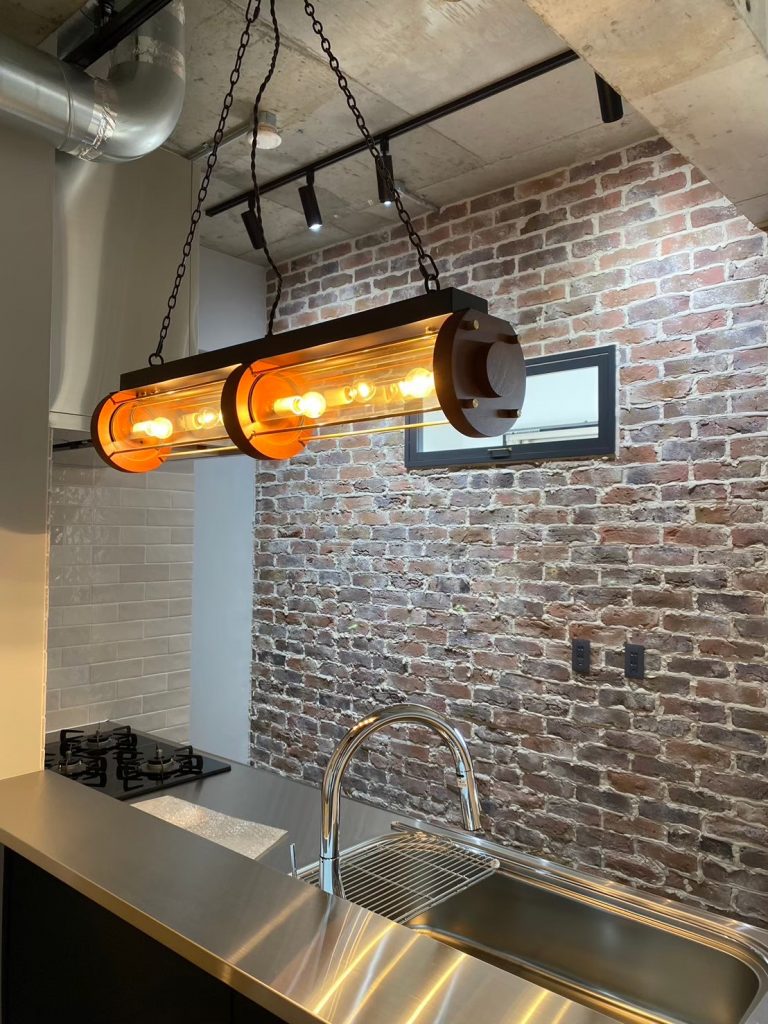アメリカンインダストリアルな雰囲気に仕上げるためにキッチンの背面は一面ブリックタイルを貼付しました。