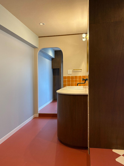 玄関を入るとまず目に入るのは、ミッドセンチュリームードの洗面台。