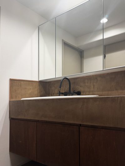 造作洗面モールテックスも、ダイニングテーブルと同じブラウン系で統一。