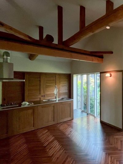 木製の建具・キッチンの腰壁は、ヘリンボーンの床に合わせてコーディネート。