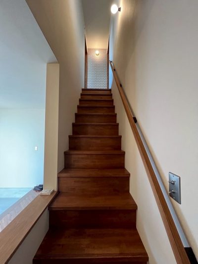 玄関から真正面に見えていた階段は、向きとデザインを大きく見直し、横向きにレイアウトを変更。
