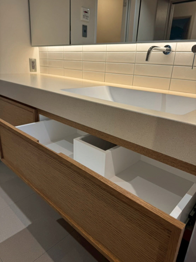 引き出しにはオーク材を使用。ナチュラルに馴染む木目を選びました🪵