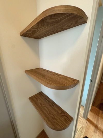 棚板などの素材は、優しい印象の空間に合わせて木目の幅が大きく出るタモ材を採用。