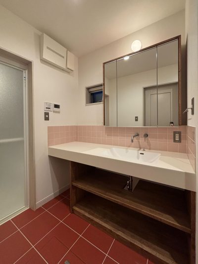 洗面台は、他の空間とは違う楽しい色使いのデザインをご提案。