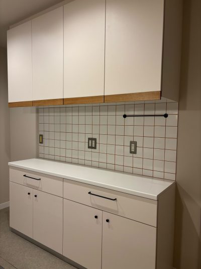 面材にシートを、取手はアイアンに変更することでシンプルながらも可愛いキッチンに仕上がりました。