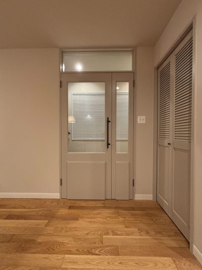 メインの造作扉は、壁に馴染みつつもほんのりアクセントとなる淡いグレーを採用✔️