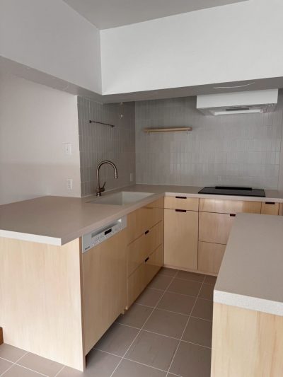 キッチンや建具の木材を引き立てるため、床にはフロアタイルや、マーモリウム中心にご提案しました💡
