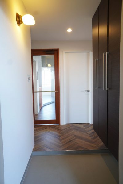 玄関部分も既存利用をしつつ、素材で雰囲気をガラリと変更。
