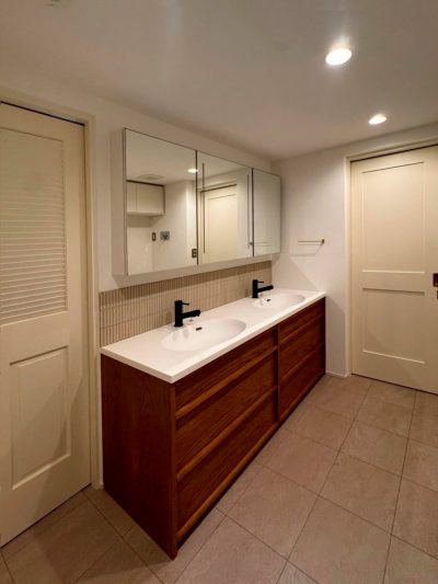 洗面台は、深みのあるブラウンの洗面台収納×グレージュのタイル×ブラックの水栓で大人っぽい印象に。