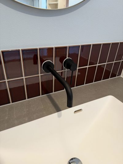 柔らかいトーンの水色クロスと、深みのあるタイルのカラーコーディネートが素敵な空間に◎