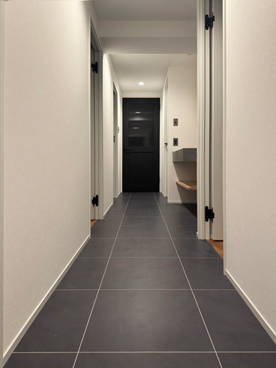 廊下には、黒のタイルを取り入れることで統一感のある住まいに。